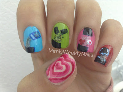 Day 1s theme is "Sugar, Spice and Everything Nice". I figured that a lot of girls would to either candies or Powerpuff Girls. Not wanting to do exactly what all the other girls do, I took my own spin on this mani. My nails were in fact PowerPuff Girl themes, but instead of painting the girls, this is what I did: